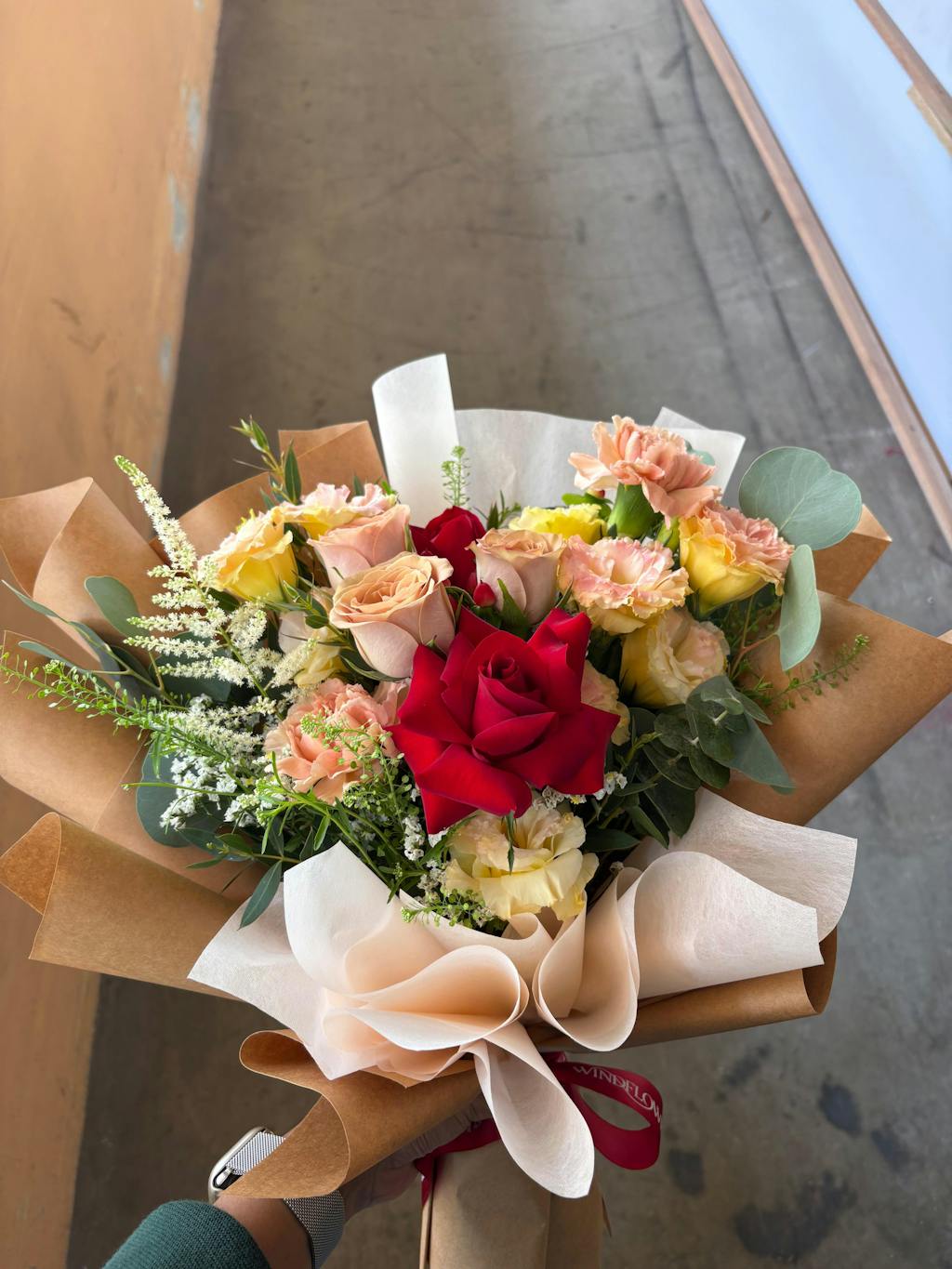 In need of a perk-me-up? This gorgeous bouquet of cappuccino roses accompanied by carnations and red roses sure works better than caffeine!