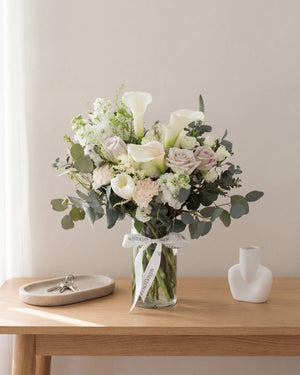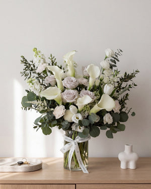 This arrangement of pristine calla Lilies and menta roses exude serenity.