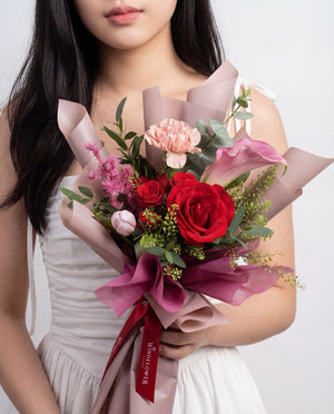 Make a gesture of infinity love with this bouquet of calla lily, tulip and roses in bold tones.