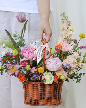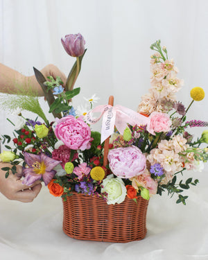 A lush springtime celebration in a classic rattan basket, overflowing with premium peonies in soft pinks and whites, accented by fresh eucalyptus, dahlias, and delicate fillers for a romantic, glowing cascade—ideal for gifting elegance that lasts.