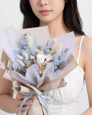 Convey your love to the angel of your heart with a bouquet of khaki preserved rose paired with pastel blue and white filler flowers.