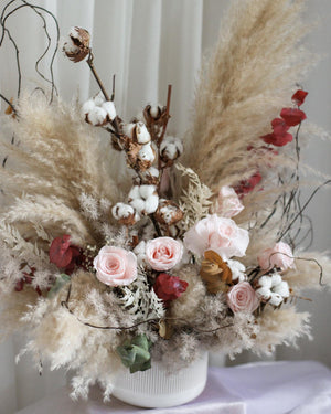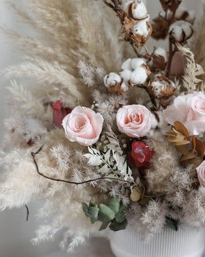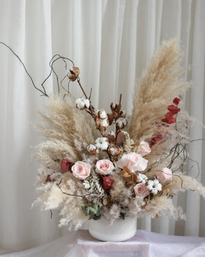 This one of a kind centrepiece is specially crafted as a singular piece.Featuring preserved roses paired with dried pampas, it showcases a rich play of rustic tones and natural textures. Designed to create warmth and character, this statement arrangement brings timeless charm to any space.