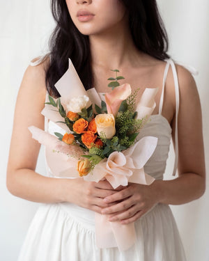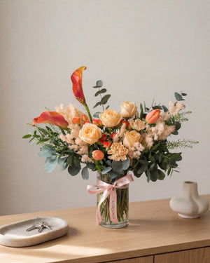 用这束以暖色调为主的马蹄莲、郁金香和玫瑰花束,表达永恒的爱意。
