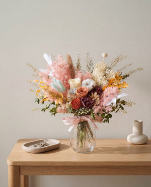 这款花束风格大胆而温暖,以焦橙色的永生玫瑰为主花,周围环绕着浓郁的红色和引人注目的填充花朵。