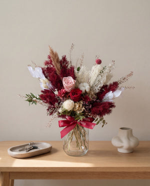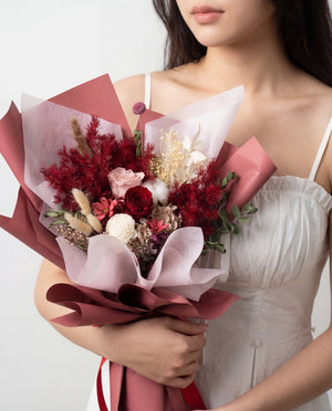 酒红色永生玫瑰搭配白色和淡粉色的配花,表达你炽热的爱情。